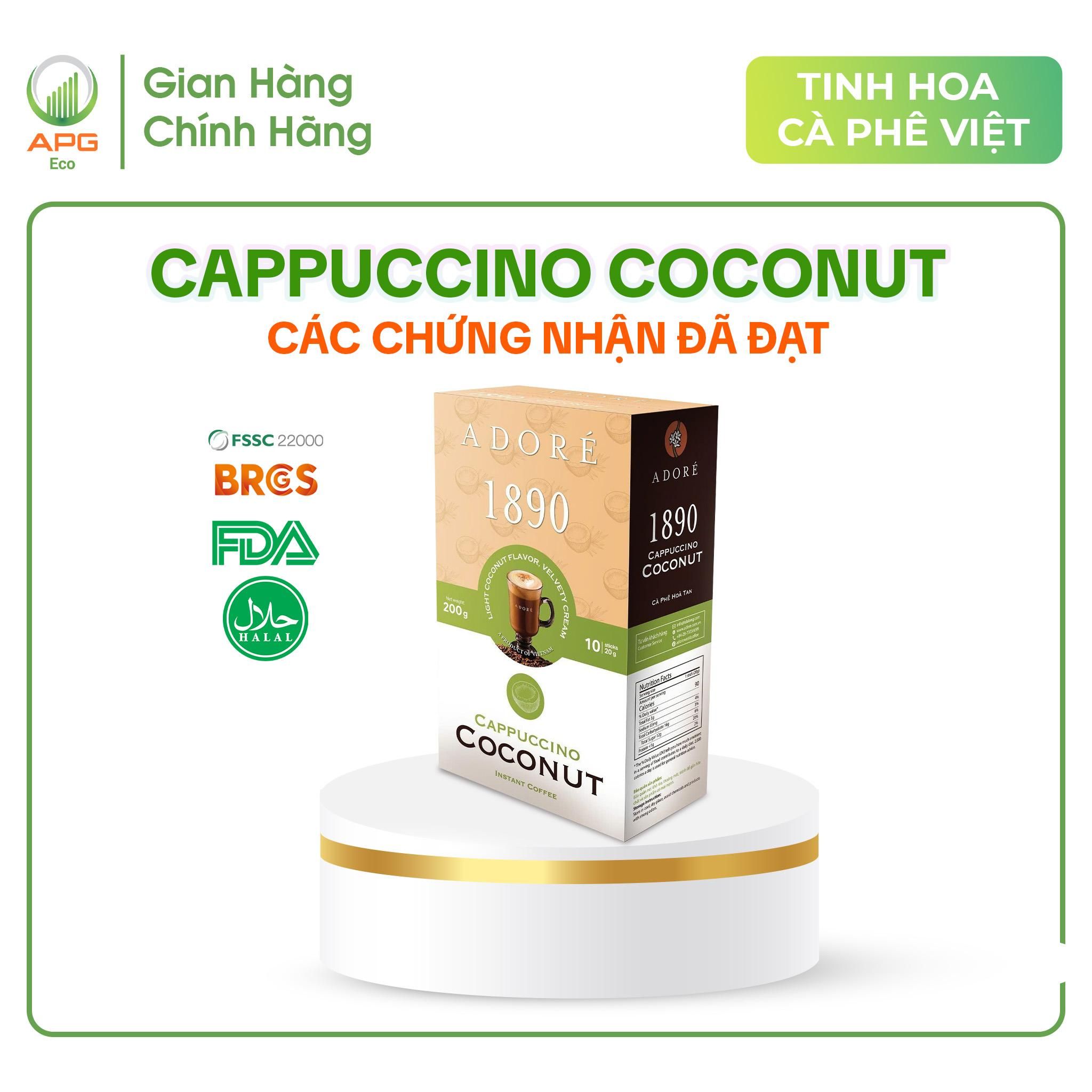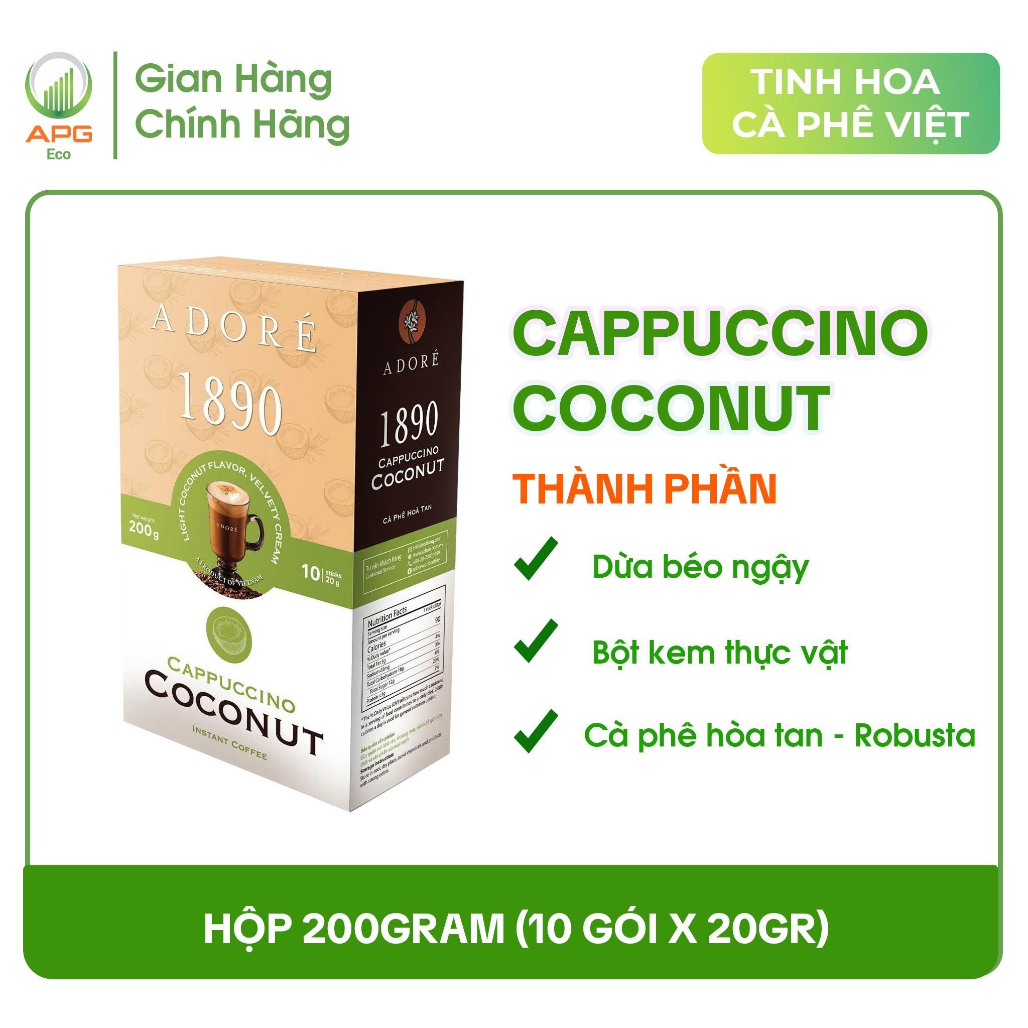 - Cà Phê Hòa Tan ADORÉ 1890 Cappuccino Coconut Cafe 3in1 Vị Dừa Thơm Ngậy Giúp Tỉnh Táo Tập Trung Hộp 200g (10 gói x 20g)