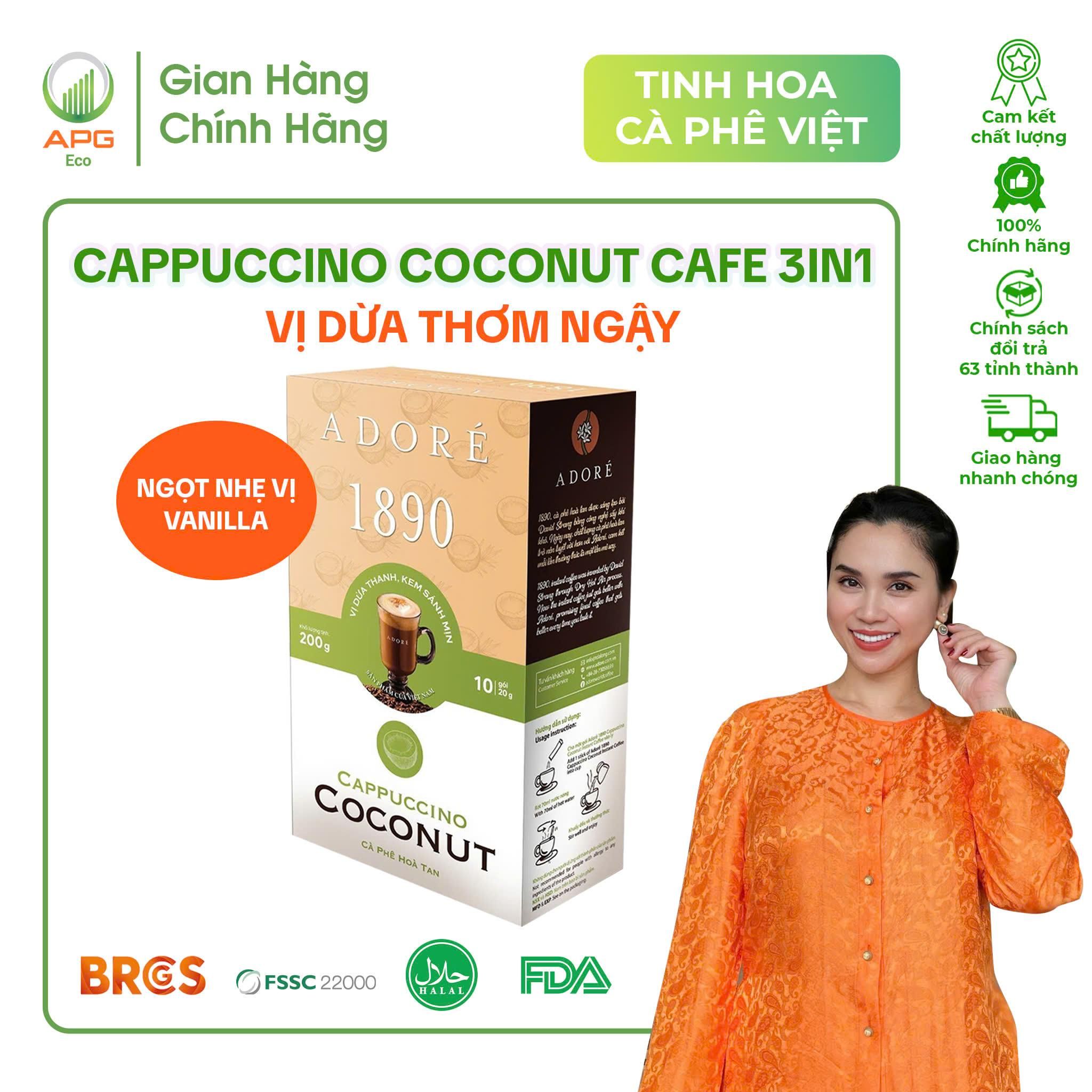 - Cà phê hoà tan mang hương vị ngọt ngào khó quên của cà phê sữa, hoà cùng hương thơm nhẹ từ cốt dừa. Cà phê hoà tan Adoré 1890 Cappuccino Coconut là một sự kết hợp hoàn mỹ giữa sự béo ngậy của sữa và những hạt cà phê tinh túy.