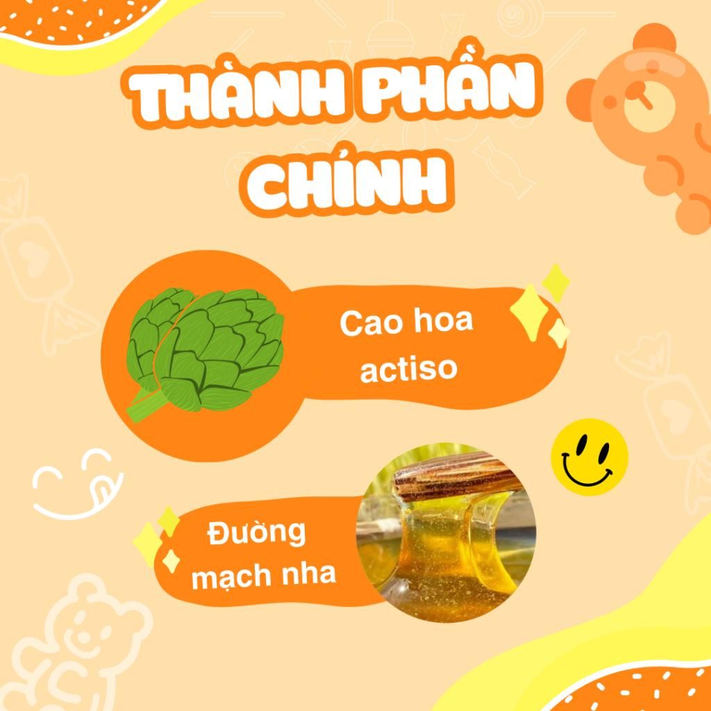 - Cao hoa actisô 5%, đường, mạch nha, gelatin, pectin, acid citric.
