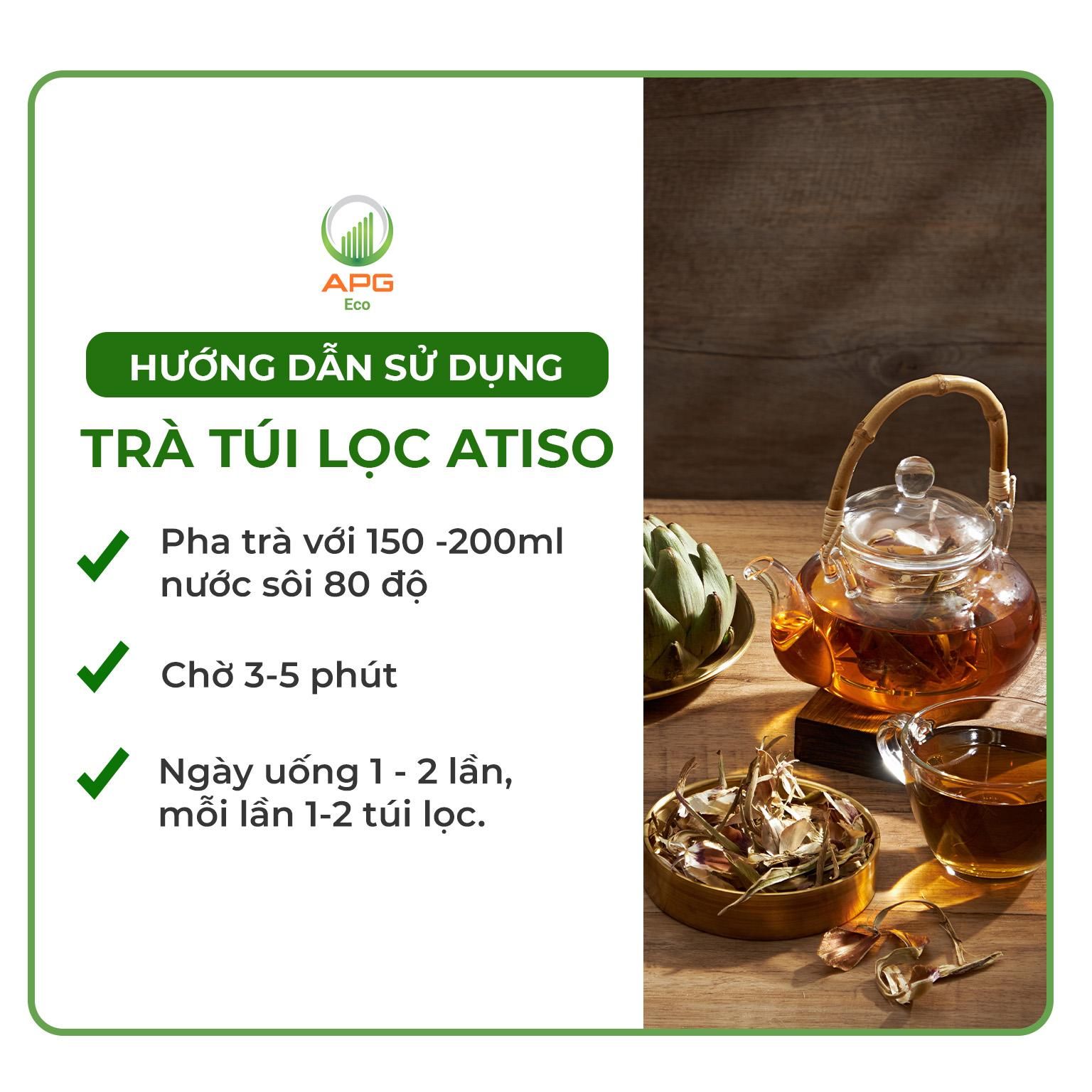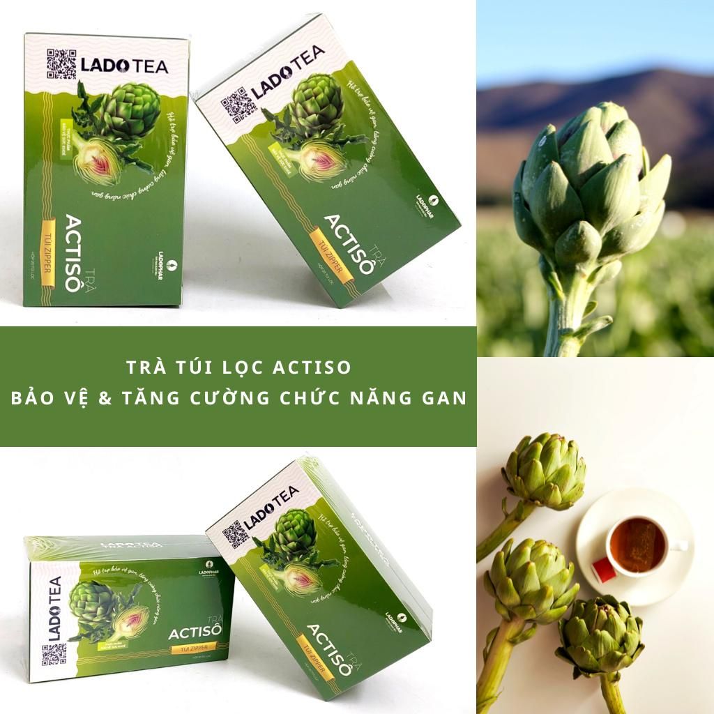 - Thành phần: Trong 01 túi lọc 2g có chứa: Bột Actisô: 1,65g Bột Cỏ ngọt: 0,31g Cao đặc Actisô (tương đương 1,4g lá tươi Actisô) (tỷ lệ 1:35): 0,04g