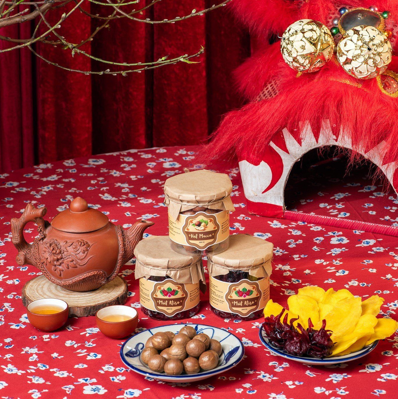 Thành phần: Gạo Vebo ST25 - 2kg; Mứt Atiso 200gr; Trà túi lọc Ladophar; Trái cây sấy (mít) 100gr; Trái cây sấy (ổi) 100gr; Hộp maca 250gr; Savon Đàn hương; Lì xì.